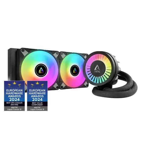 The Arctic Liquid Freezer III 240MM RGB Liquid CPU Cooler is a cooling solution that combines great thermal performance with gorgeous aesthetics. It has two P12 PWM fans with speeds ranging from 200 to 1800 rpm, allowing for strong and customizable airflow to keep your CPU cool even under high load. A VRM fan that works between 400 and 2500 rpm, controlled via PWM for precise speed changes, improves cooling for the voltage regulation modules and contributes to overall system stability. The pump, which is also PWM controlled, works at speeds ranging from 800 to 2800 rpm, guaranteeing dynamic coolant flow adapted to your system's thermal requirements while producing little noise. The cooler's cold plate is made from high-quality copper and features micro-skived fins, significantly improving heat transfer efficiency. This architecture enables for good heat dissipation from the CPU to the coolant, ensuring that your processor operates at optimal temperatures even during intensive computing operations. Beyond its amazing technical characteristics, the Arctic Liquid Freezer III 240MM RGB has colorful RGB lighting, which adds a visually attractive aspect to your build. This configurable lighting allows you to make your setup unique, resulting in a dynamic and interesting visual experience. The Arctic Liquid Freezer III 240MM RGB Liquid CPU Cooler combines powerful cooling capabilities with striking aesthetics, making it ideal for gamers, overclockers, and PC enthusiasts wanting to preserve optimal performance while adding a touch of beauty to their system.
